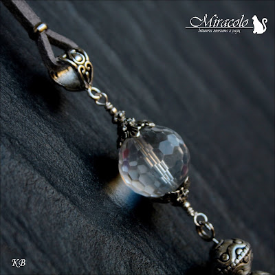 Materiały : 2cm fasetowana kula kryształu górskiego, 3x4mm oponki kryształu górskiego, 9x7mm fasetowana częściowo oszroniona kropla kryształu górskiego, syntetyczny rzemień w kolorze stalowym, ozdobne metalowe elementy w kolorze oksydowanego srebra.
